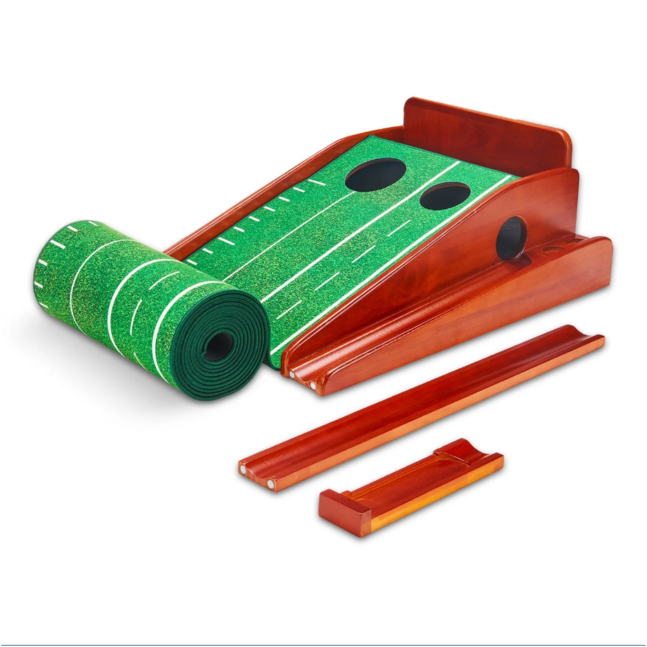 Guides are printed like train tracks down the lane, so your eyes learn square face, square path, square start line. Distance markings along the runway help you calibrate backstroke length to rollout, an underrated skill that transfers straight to the course. The elevated end section gives you two holes to aim at (standard and small), and the built-in ball return feeds back to your feet. It’s almost meditative: roll, return, repeat.