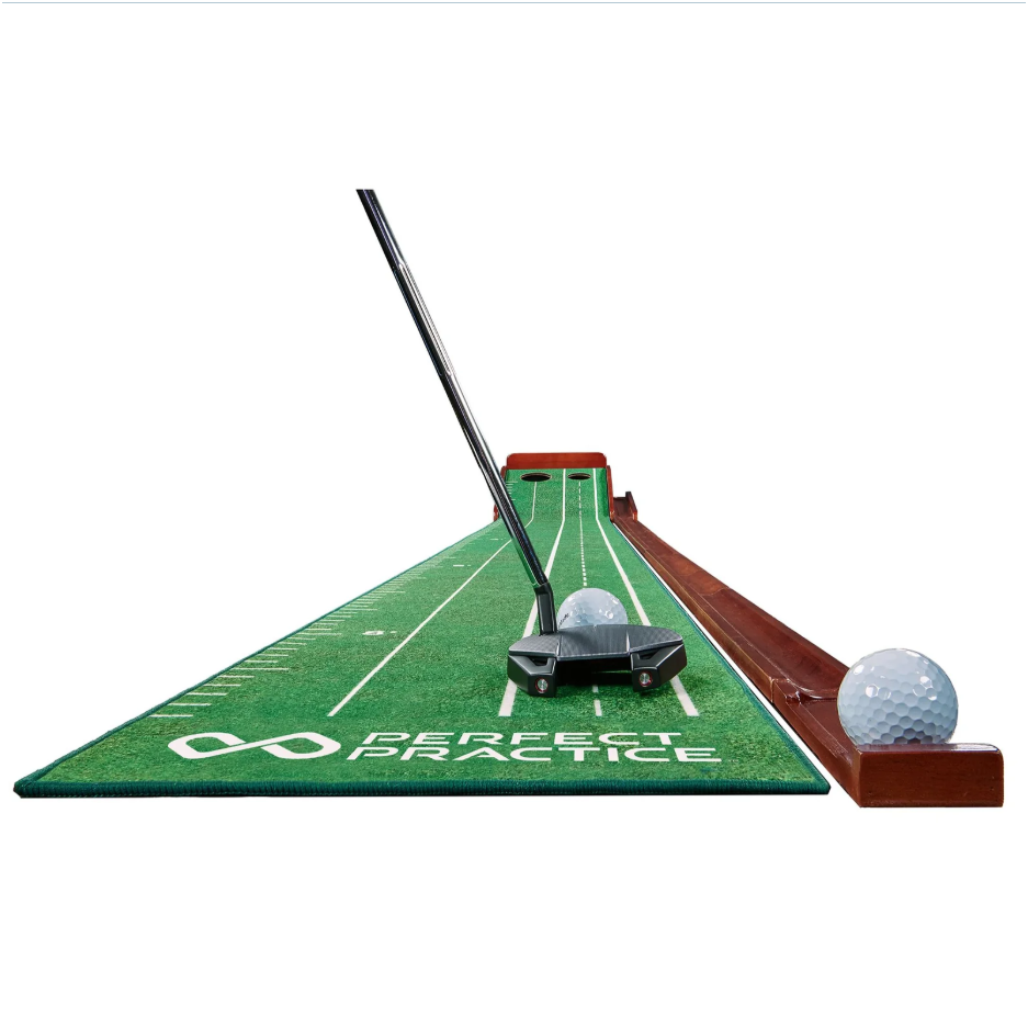 Accuracy / performance. Compared with PuttOUT and Callaway Odyssey mats that prioritize a compact footprint, Perfect Practice gives you a truer-feeling, longer runway with alignment rails plus two target cups—so you train start line and capture speed, not just “don’t miss short.” WellPutt is famous for drill graphics, but it doesn’t include an automatic return; the Perfect Practice loop keeps your stroke tempo steady and your reps high. Against thicker foam greens like Big Moss or BirdieBall, the crystal velvet here feels faster and cleaner off the face, closer to the quicker stimp many sim golfers set on virtual courses.